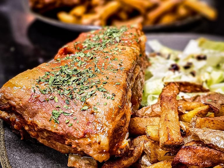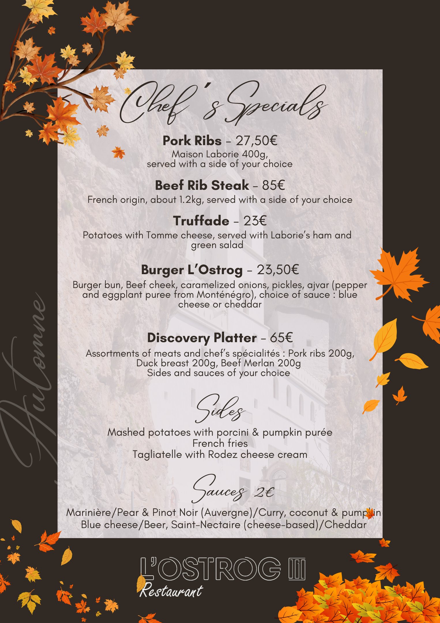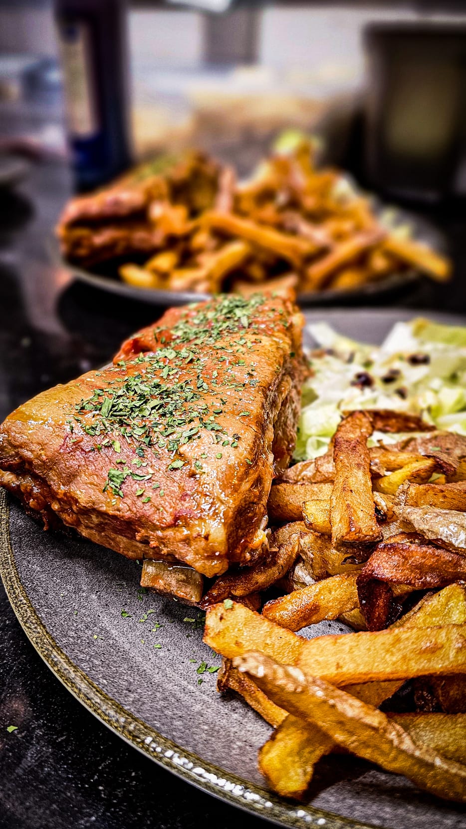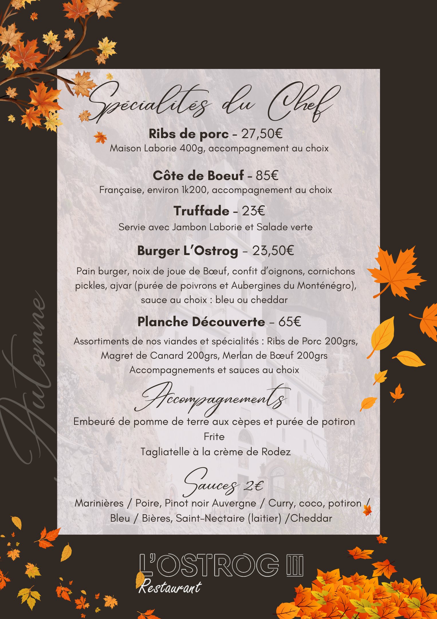 Assortiments de nos viandes et spécialités : Ribs de Porc 200grs, Magret de Canard 200grs, Merlan de Bœuf 200grs Accompagnements et sauces au choix